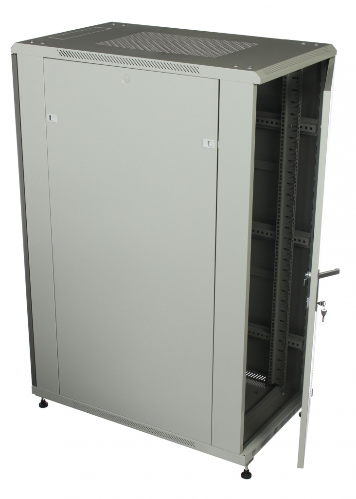 4. Задняя дверь с ключом и замком – в зависимости от глубины шкафа может быть глухой металлической, либо металл – перфорация, следовательно, с глубиной до 800мм в комплектации идет дверь металл-глухая. С глубиной более 800мм идет задняя дверь металл-перфорация. Это связано с тем, что для более мощных серверов нужна более интенсивная циркуляция воздуха, и больший объем воздуха, который поступает через отверстия в перфорированной двери.
