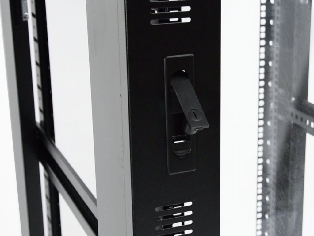 3. Передняя дверь с замком и ключами - замок защищает от несанкционированного доступа нежелательных лиц в телекоммуникационный шкаф, а сама дверь может быть как стеклянной (каленое тонированное стекло для визуального осмотра работы оборудования внутри серверного шкафа), так и глухой металлической или перфорированной,